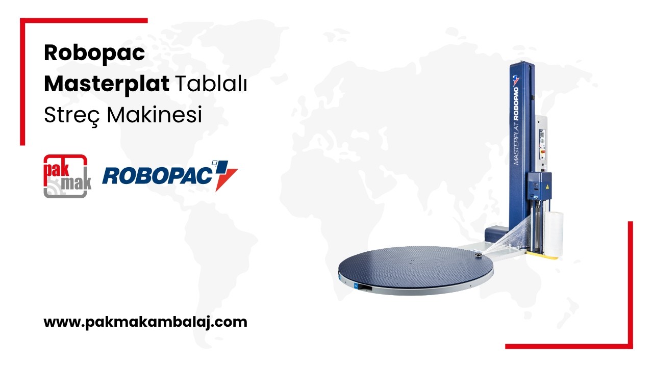 Robopac Masterplat Tablalı Streçleme Makinesi, paletli ürünlerin güvenli, dengeli ve ekonomik şekilde sarılması için geliştirilmiş yarı otomatik bir streçleme çözümüdür.